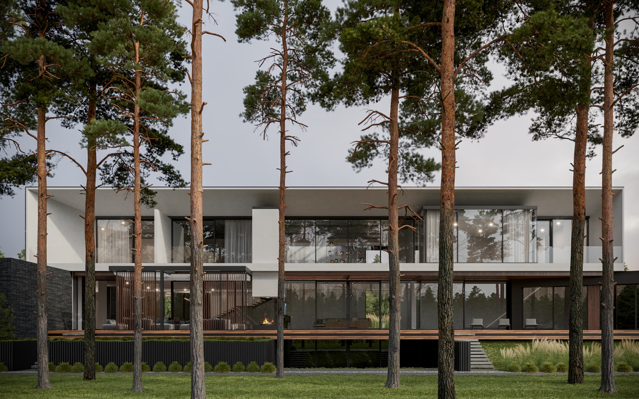 Проект этого дома разрабатывается комплексно, вместе с дизайн-проектом интерьера, что позволяет учесть любые пожелания к организации внутреннего пространства на стадии расчетов каркаса и выжать максимум из прекрасных видов. открывающихся с территории участка.