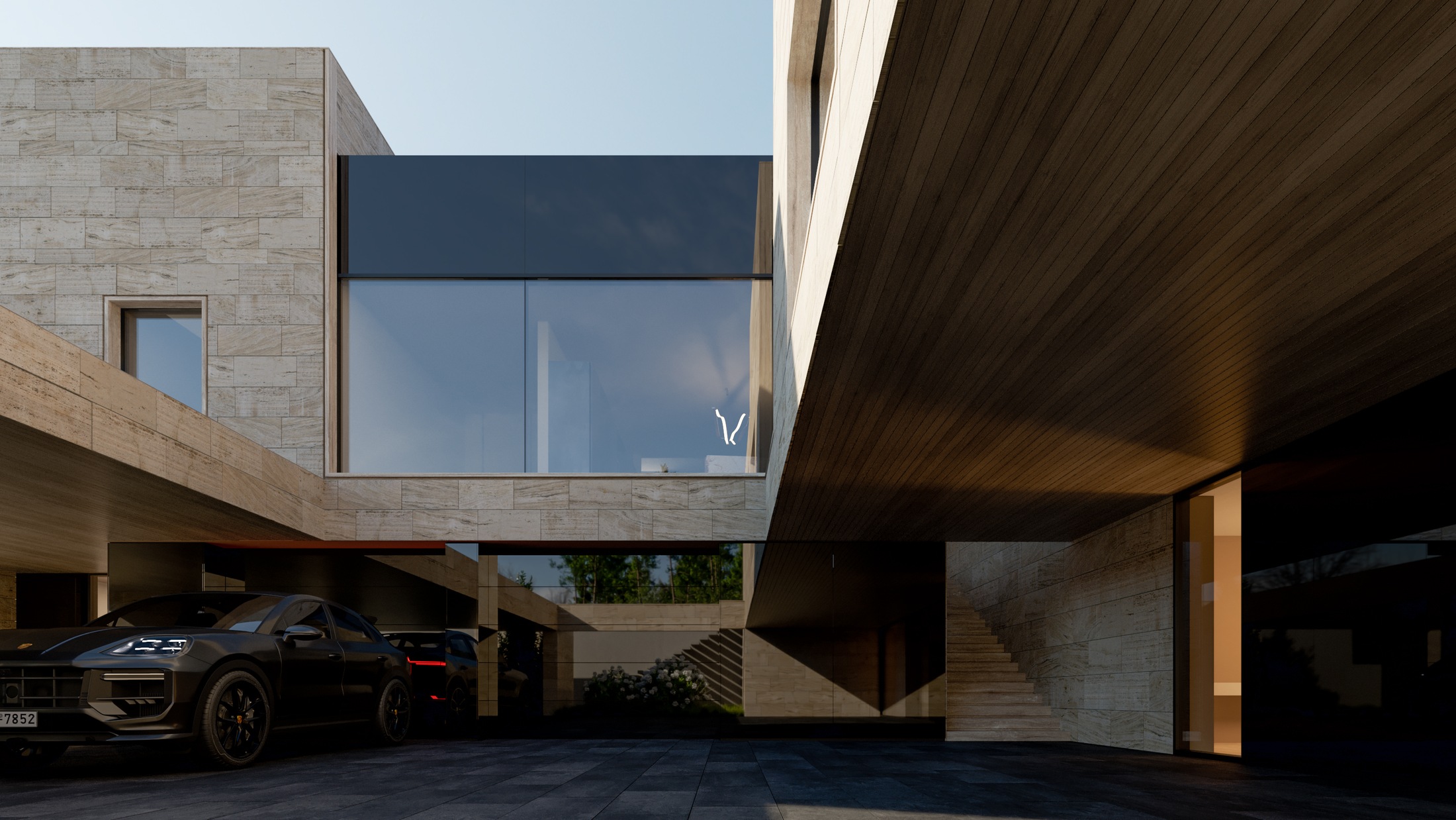 Композиция дома основана на условном повторении линией верха здания контура вершин деревьев, с "отсеканием" снизу этой массы вытянутой линией остекления. Отделка фасадов брутальным камнем в верхней части, неразрывная линия остекления снизу, заставляющая парить в воздухе каменный массив верхнего этажа, контрастирующий с отделанными черным стеклом поверхностями, создают ощущение архаической надежности, а тактичное использование резных каменных профилей по периметру козырьков и окон подчеркивает контраст между огромной каменной массой фасада и любовно отделанными элементами, находящимися на расстоянии вытянутой руки от зрителя.