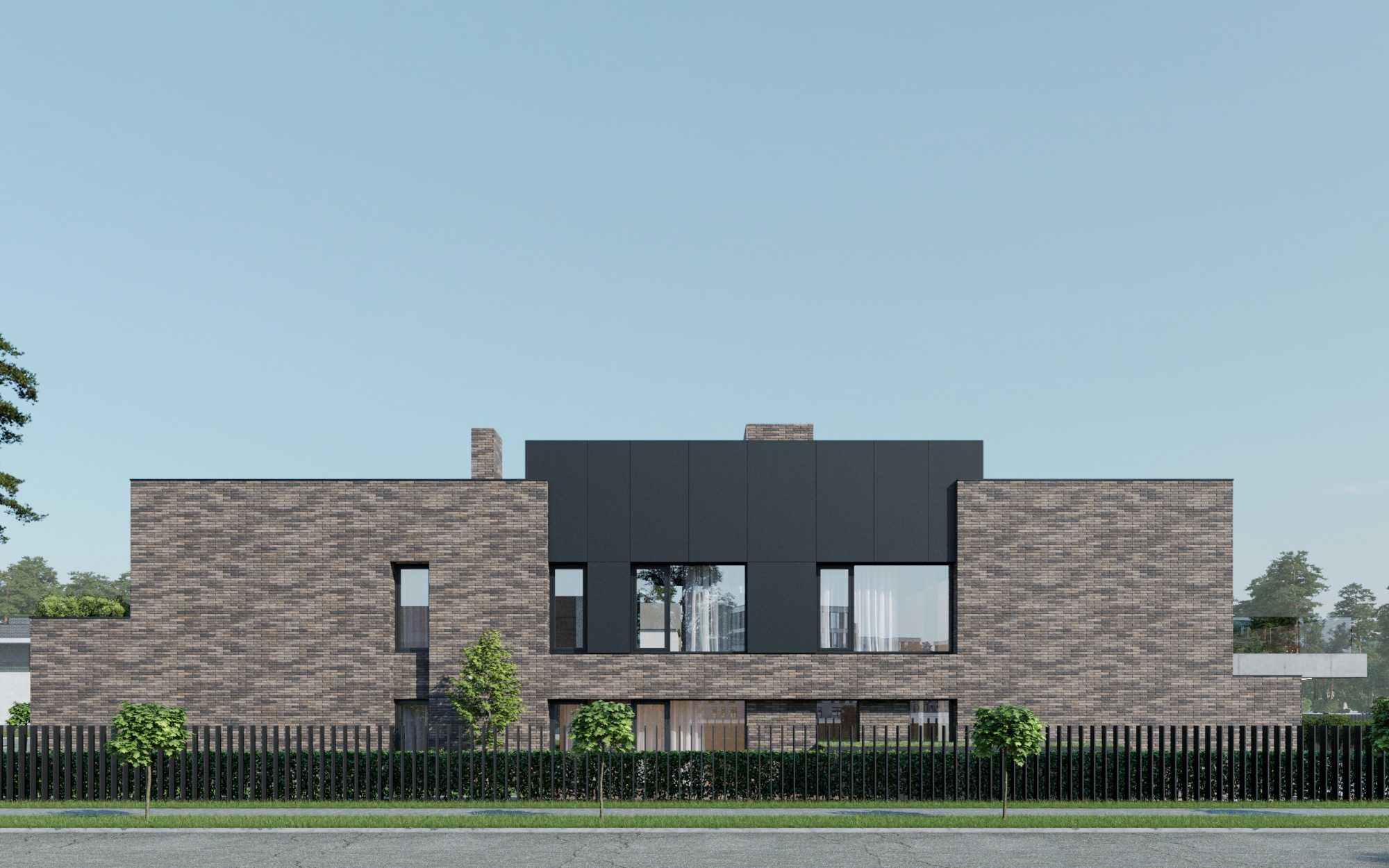 Внешний облик дома поменялся кардинально, хотя некоторые, уверен, узнают общие очертания коробки дома. Кирпич ручной формовки и суровые бетонные навесы прекрасно контрастируют с панорамным остеклением, позволяющим максимально раскрыть нужные помещения на улицу.