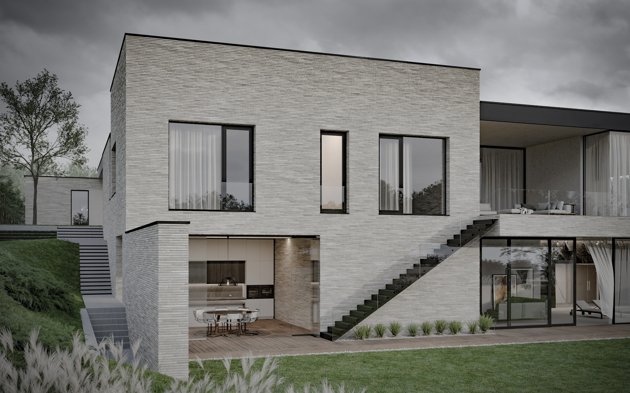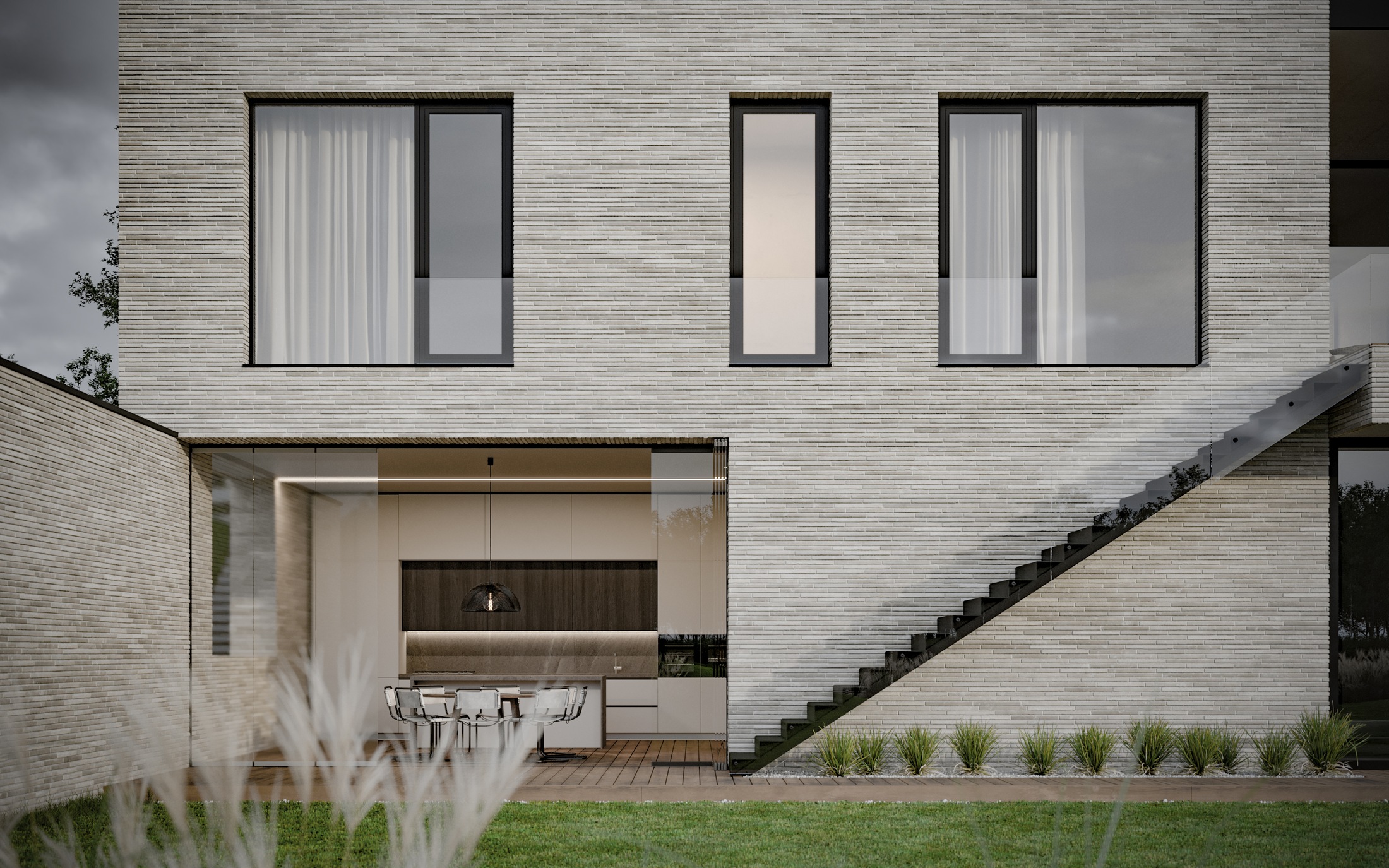 Композиция дома крайне минималистична, основана на контрасте масс и пустот, а также сочетании любимых всеми материалов - белого кирпича ручной формовки и панорамного стекла.