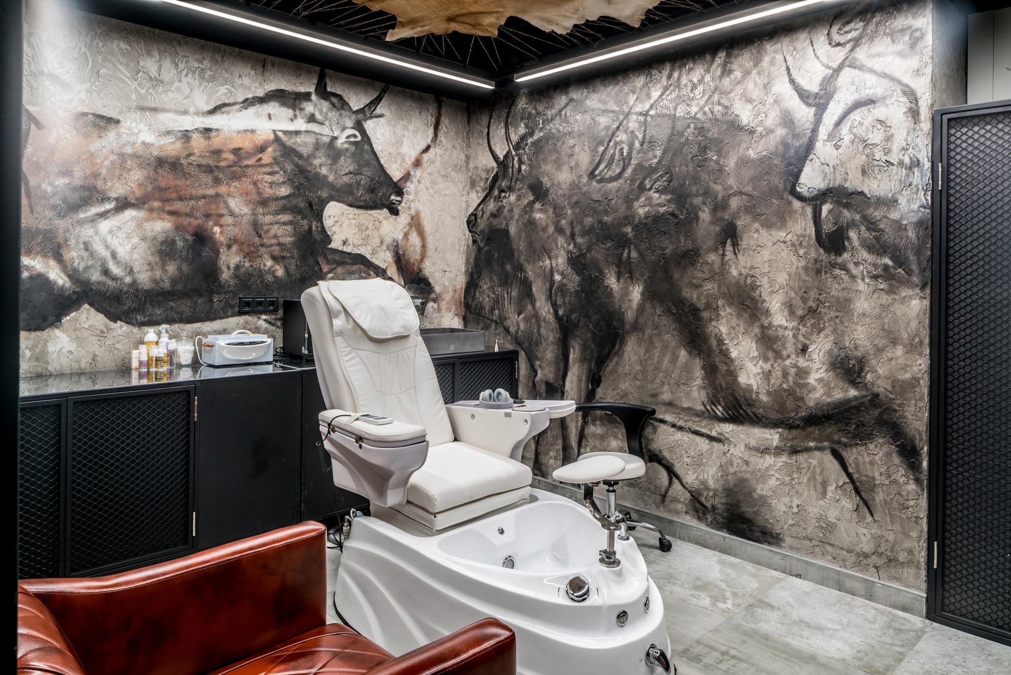 Основной идеей в дизайне помещения стала имитация первобытной пещеры, в которой расположилось жилище, условно разделенное на "зоны": зона рецепции с каменной стойкой, зона отдыха рядом с мощной скалой и "очагом", зона отдыха и вип-зона в глубине пещеры, зона работы мастеров недалеко от основного "очага".