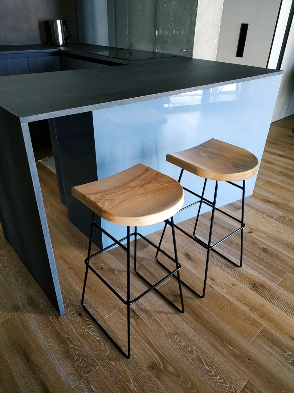 В рамках дизайн-проекта этой квартиры удалось создать единое пространство гостиной, кухни и столовой за счет ликвидации длинного бесполезного коридора. В результате появилось место для большого обеденного стола, огромного дивана и кухни с островом, визуально разграничивающим пространство. Дизайн фасадов кухни из керамики брутальной фактуры удачно дополняет шлифованные бетонные потолки с открытой разводкой электрики, паркет естественного оттенка уравновешивает белые гладкие стены и скрытые дверцы шкафов. Стол из грубого ясеня с ажурным стальным подстольем, тумба под телевизор и сиденья барных стульев из того же ясеня, дверь в кладовку из древнего дерева, грубо покрашенная в яркий бирюзовый цвет, вносят оттенок теплоты и рукодельности в этот достаточно индустриальный интерьер.