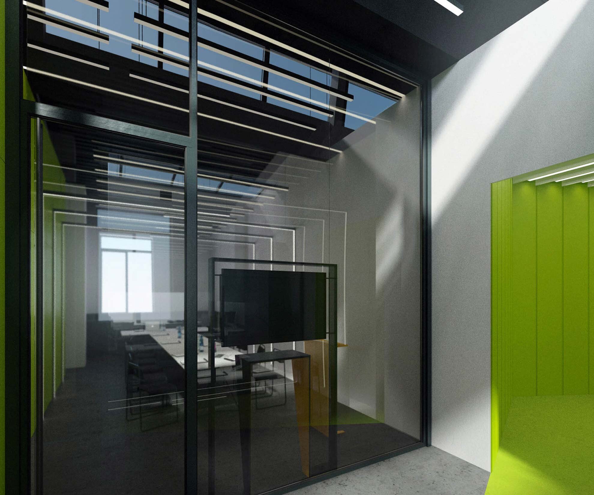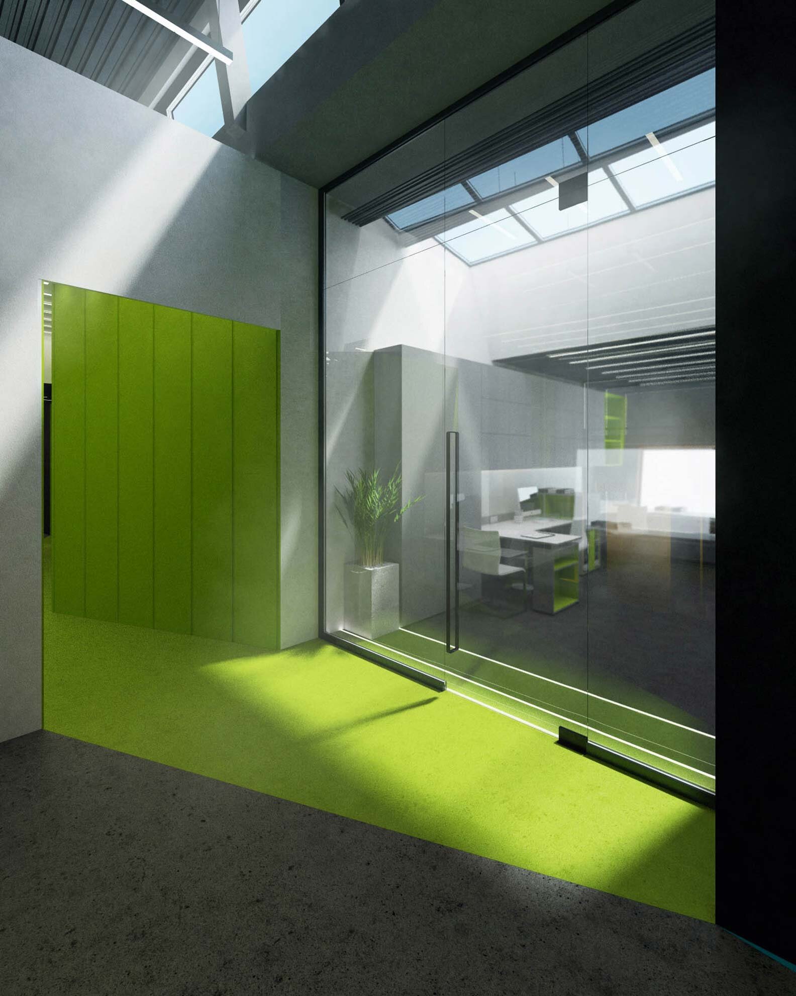 От стандартных оштукатуренных венецианкой офисных коридоров со стеной или крохотным окошком в торце и сотней одинаковых дверей у нас кровоточат глаза, а к горлу подступает предательский ком, символизирующий и необходимости срочного поиска санитарной комнаты. Хорошо, если среди сотни дверей мы сразу находим нужную. Заказчик представленного объекта полностью разделяет нашу точку зрения. Его единственное требование звучало так: "любой ценой сделайте некоридор" (тут нет грамматической ошибки). Отказ от стандартного решения горизонтальных коммуникаций привел к полному исчезновению понятия "коридор" в представленном проекте. Вместо него появилось "пространство". Все помещения стали частью одного целого, обеспечив этим максимальное взаимодействие сотрудников для достижения наилучших результатов. Мы смоделировали и сформировали процессы внутри здания, а не красили стены. Стены мы покрасили позже.
