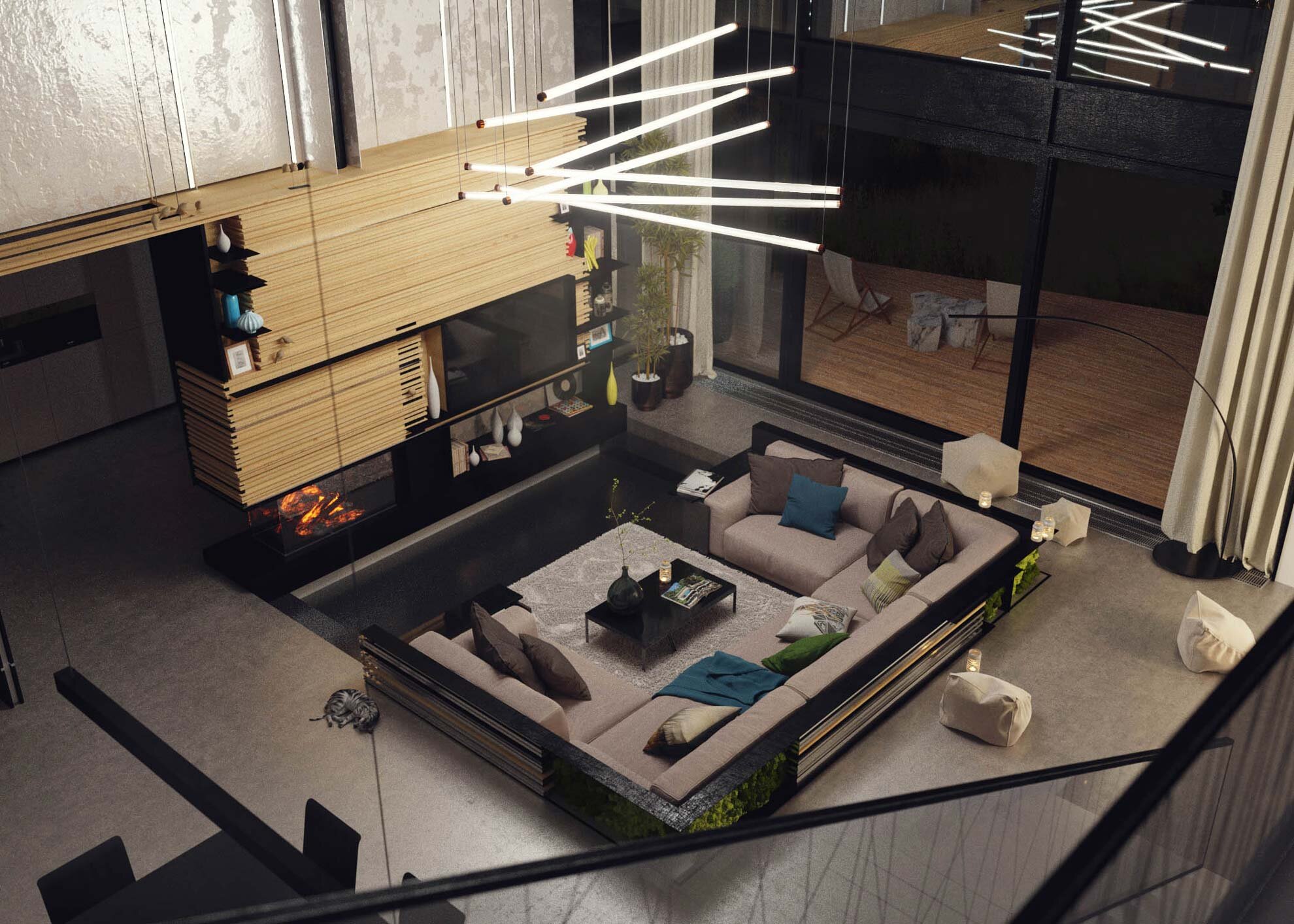 Самой интересной частью интерьера стала двухуровневая гостиная высотой в 7 метров, с балконом и огромным витражом, включившая в себя зону кухни, столовой и холла 2 этажа. Роскошная диванная зона в рамках дизайн-проекта была заглублена на 40 сантиметров ниже уровня пола, что позволило создать внутри огромного открытого пространства отдельную уютную зону. В это же двухсветное пространство открывается кухня и барная зона с элегантной стойкой, выполненные из керамики темно-серого цвета.