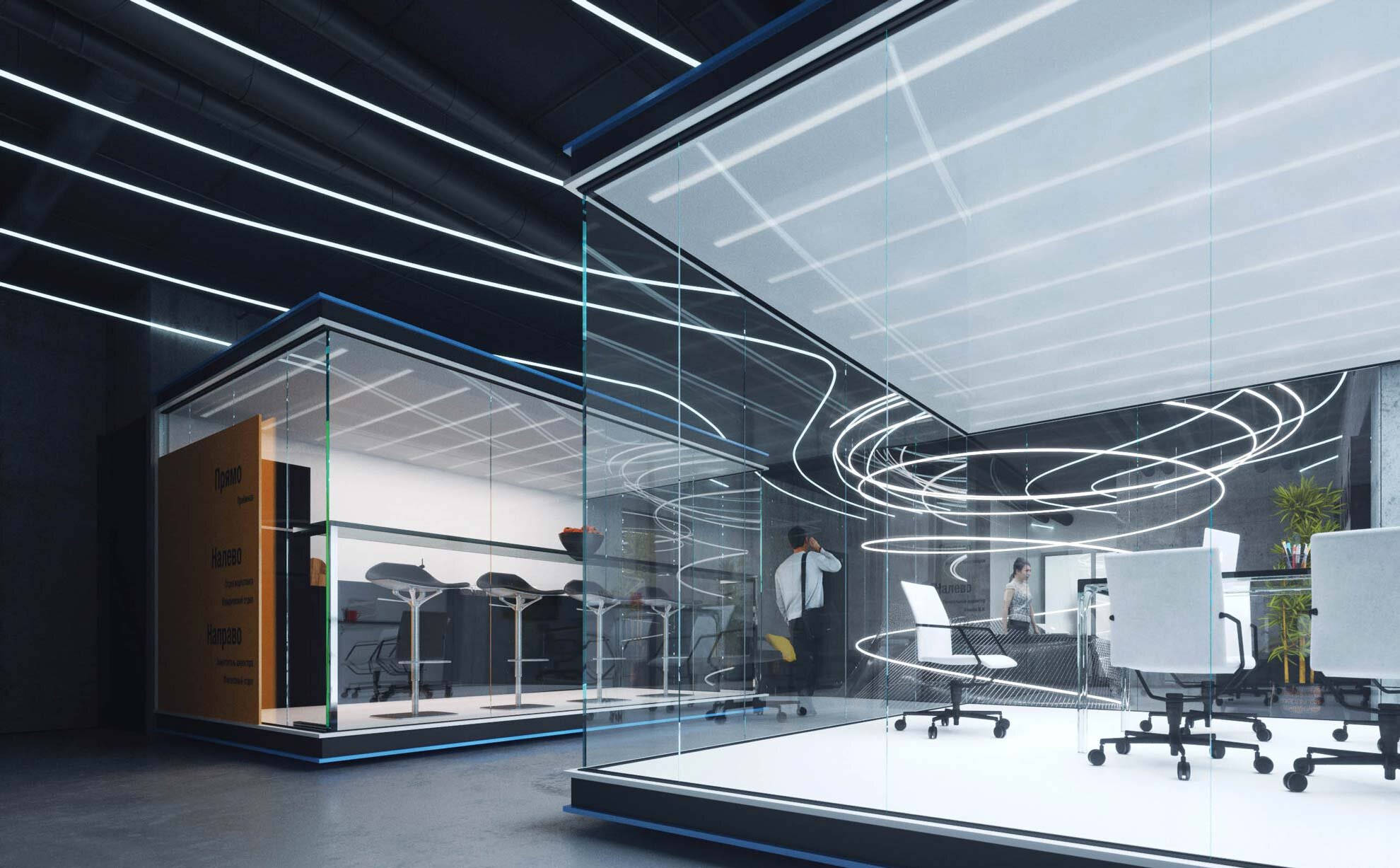 Стены из кирпича, покрашенные в кирпичный цвет1, не являются пределом дизайнерской мысли формирования офисных пространств. Время зажатых стенами коридоров, элегантно заканчивающихся дверью или интригующим поворотом за угол к лестничным клеткам, прошло. Мы заменили запроектированные перегородки на "боксы", оборудованные электрохромным стеклом (смарт-стекло2), благодаря чему вдвое увеличили пространство без ущерба для сотрудников. Наша дизайн-студия уже разрабывала (и реализовала) дизайн-проект холла на первом этаже корпуса "Riviera plaza" для компании "Бульбашъ", поэтому некоторые стилистические решения нашли своё продолжение и на офисном этаже.