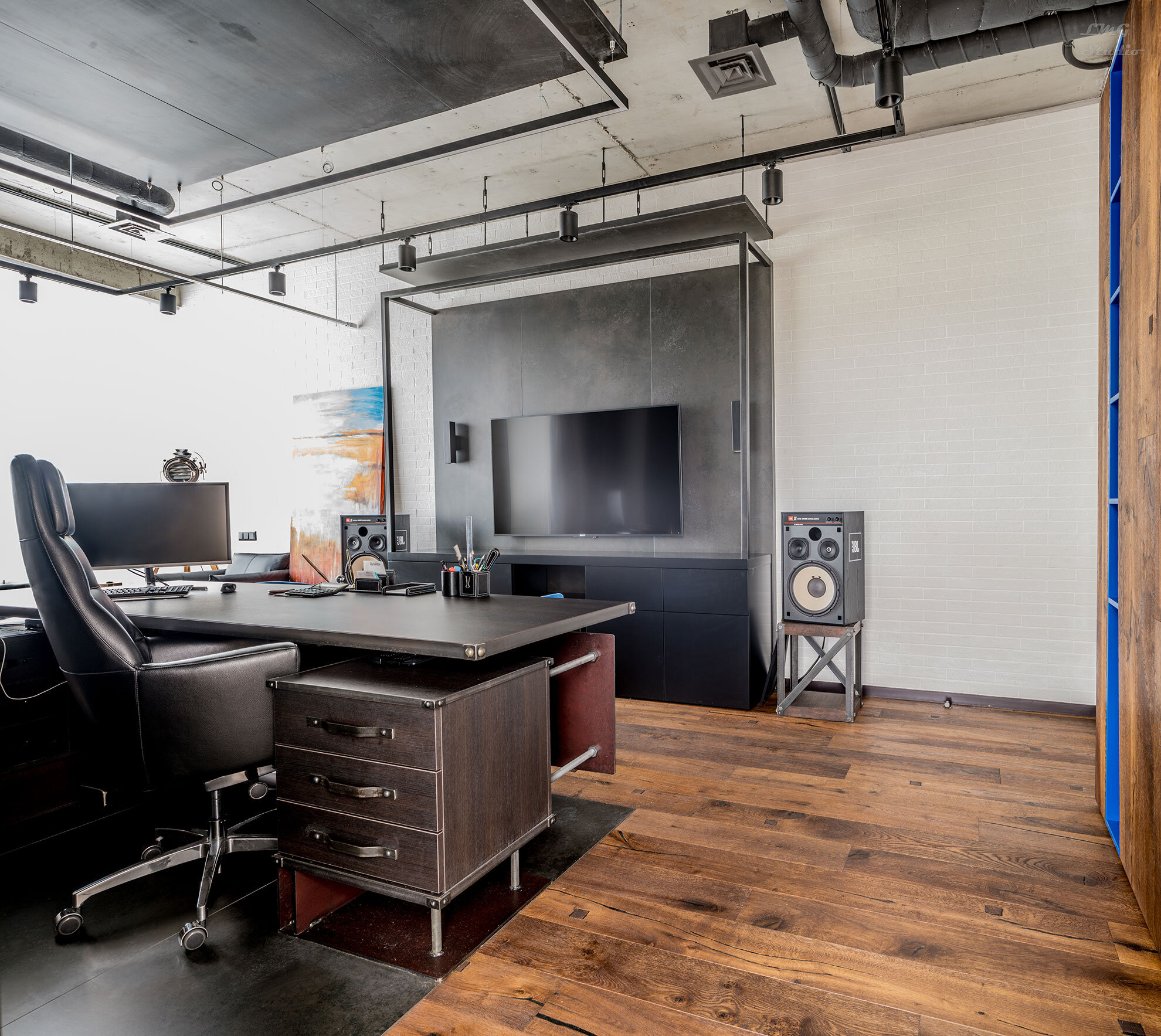 Кабинет в жестком индустриальном стиле с элементами лофта разбавлен яркими цветовыми акцентами мобильных элементов и мебелью, разработанной и выполненной по авторским чертежам.