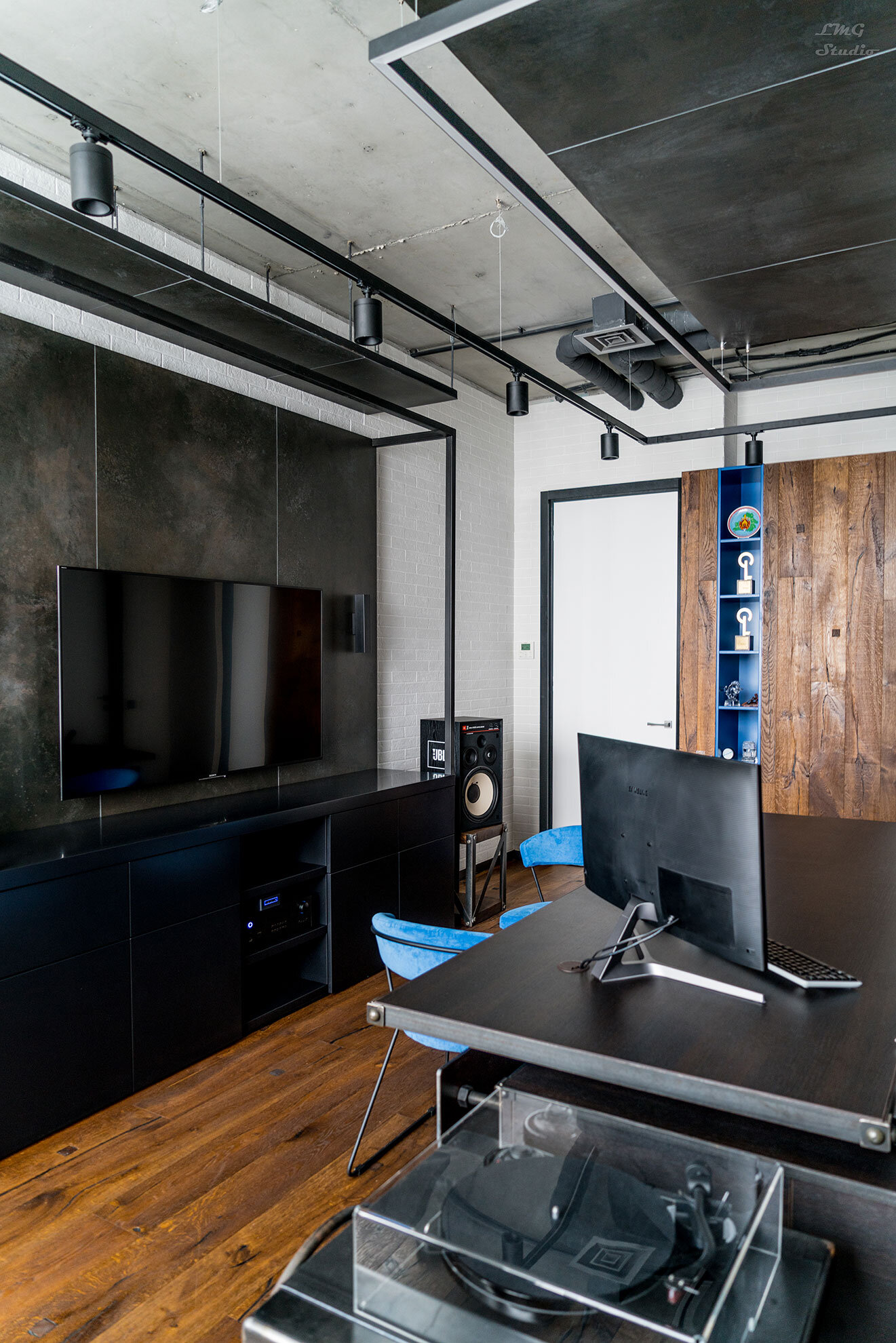 Кабинет в жестком индустриальном стиле с элементами лофта разбавлен яркими цветовыми акцентами мобильных элементов и мебелью, разработанной и выполненной по авторским чертежам.